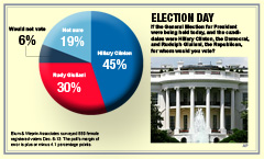 Daily News Rudy Giuliani's messy personal life is a big turnoff to women, who favor Hillary Clinton over him by a healthy margin in a new Daily News national poll of female voters. Pitting the two New Yorkers against each other in a hypothetical general election, the poll found that Clinton wallops Giuliani among women, 45% to 30%. Click here or on the photo to see more poll results. | ![]() | |